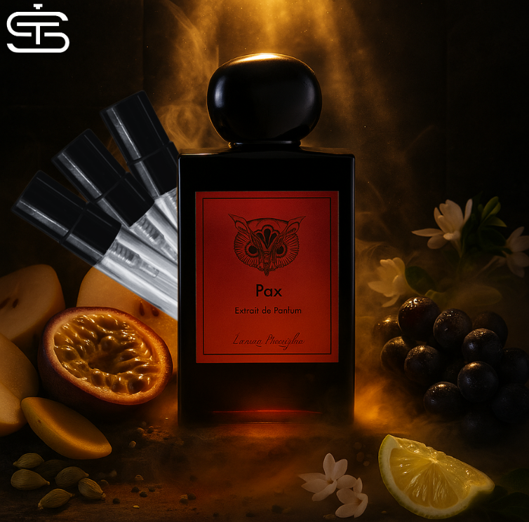 Tarde templada, luz cálida, aroma de frutas maduras con un toque de humo espiritual. Al aplicarte Pax, la apertura estalla con maracuyá jugoso, pera fresca, cítricos vibrantes y un toque de pimienta que da chispa. Luego ingresa un corazón floral-incienso: magnolia, jazmín, cardamomo, cassis que suavizan el frutal con resina luminosa. En el secado, aparece una base elegante de ámbar, vainilla de Madagascar, cuero, almizcle blanco y oud, que aporta profundidad, calor y remata con carácter noble. El perfume transmite un aire de calma potente, contraste entre luz frutal y estructura profunda.
