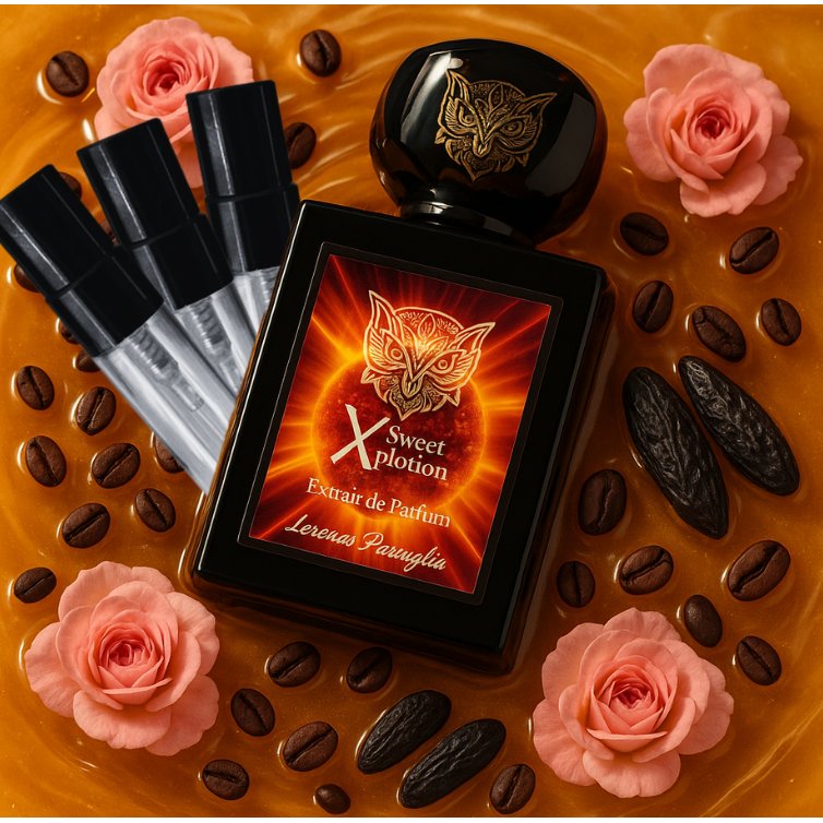 Imagina que el sol irradia una energía dorada y dulce. Al aplicarte Sweet Xplosion, se desata una explosión jugosa de cítricos: lima y pomelo chispean con nota cremosa de leche de coco y miel blanca, generando una sensación vibrante y luminosa. Conforme evoluciona, emerge un acorde cremoso y floral de rosas Taif, ylang‑ylang, argán, davana y escoba, aportando calidez, En el cierre, aparece un fondo gourmand de granos de café, vainilla dulce, haba tonka, pachulí, benjuí y almizcle, que completa una estela envolvente y sofisticada.